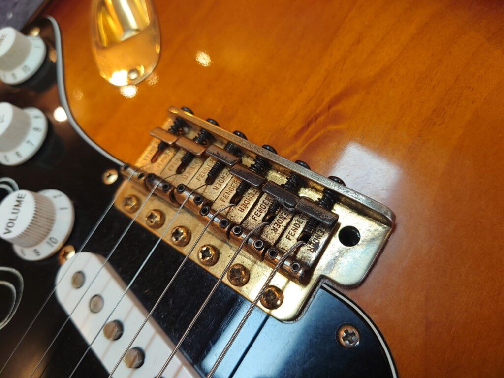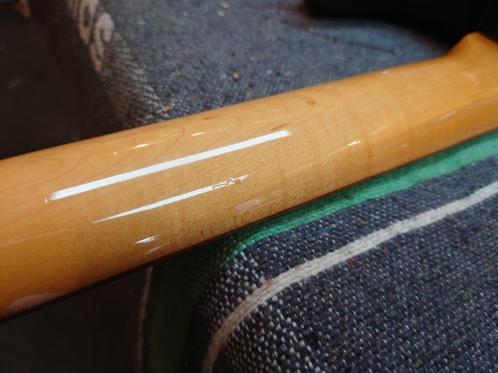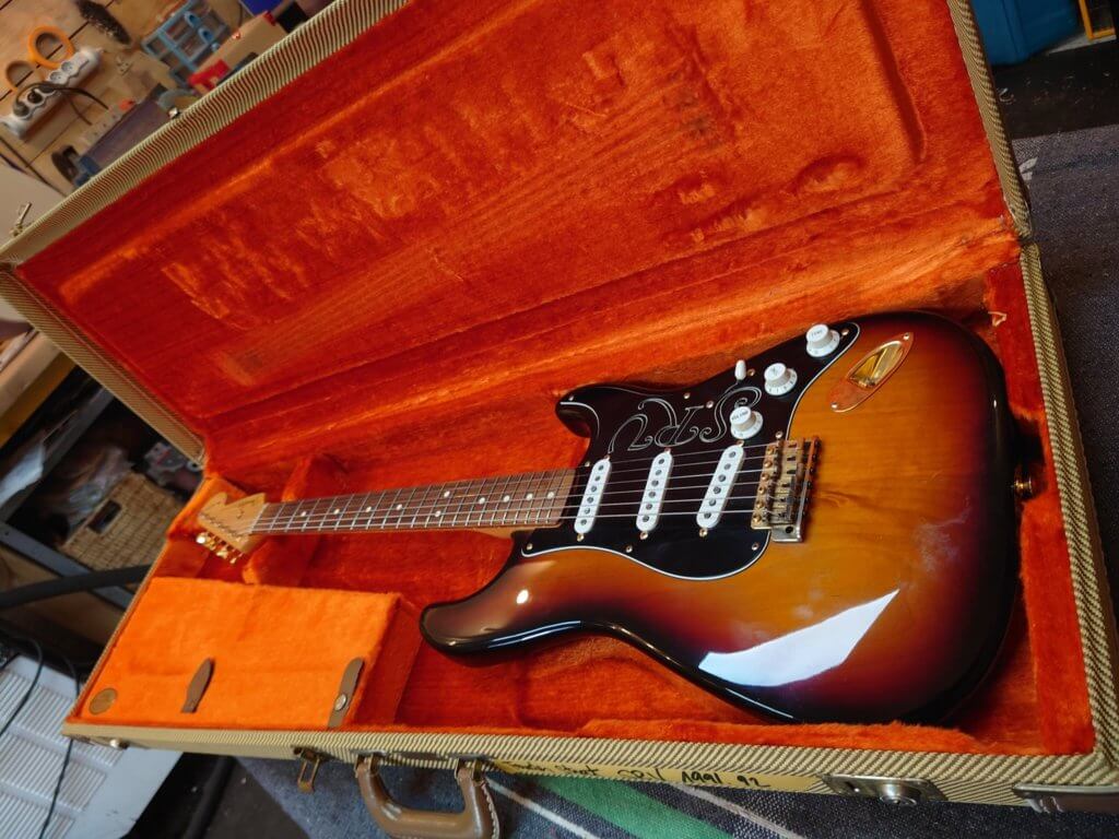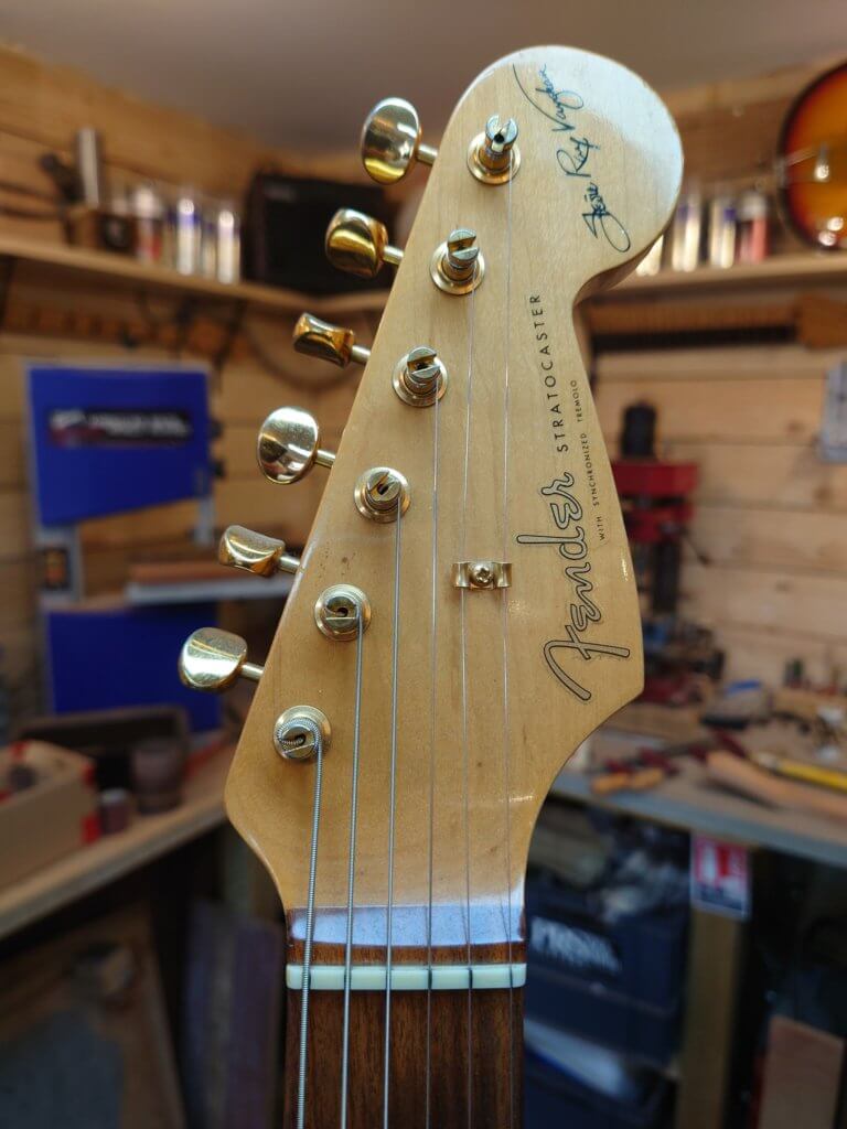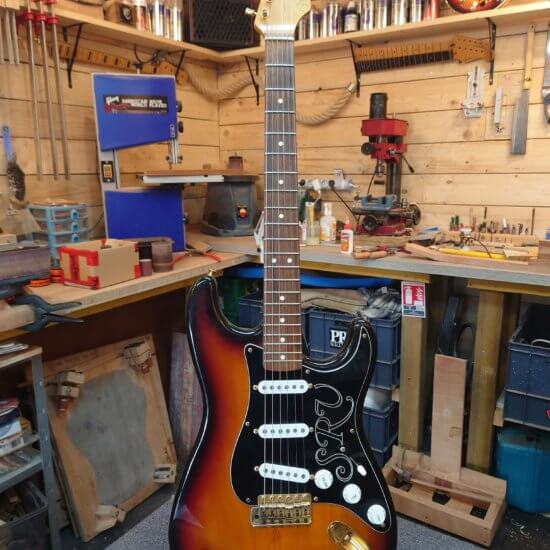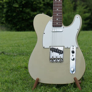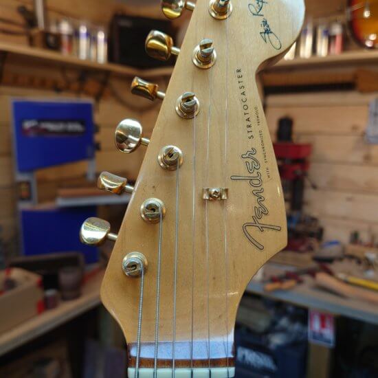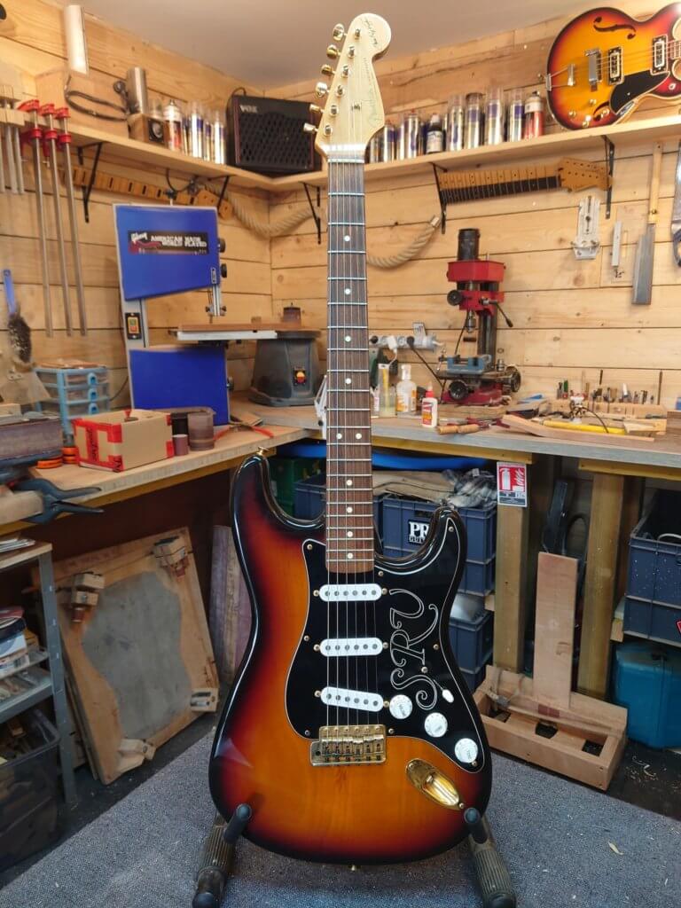 Globalement la guitare est en très bon état, les frettes sont peu marquées. Des traces de jeu sur le pickguard, un petit éclats de vernis (ceinturon) dans le dos, un petit coup sur la tranche et une égratignure sur le manche…
