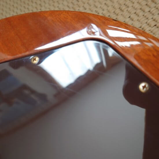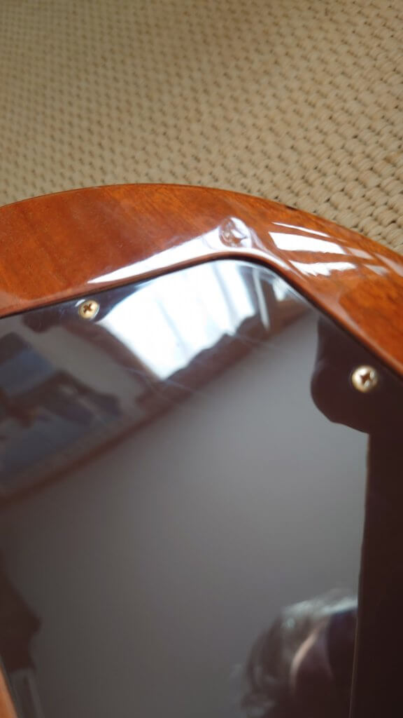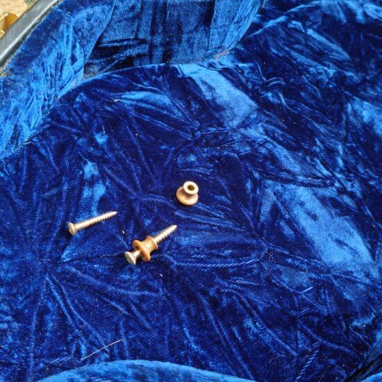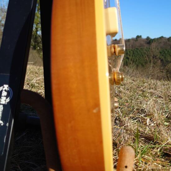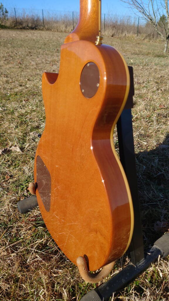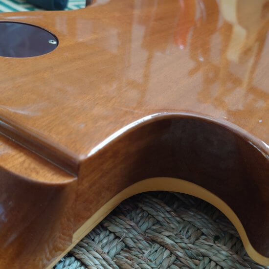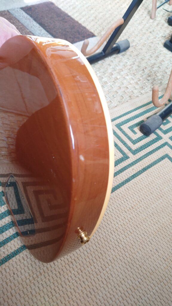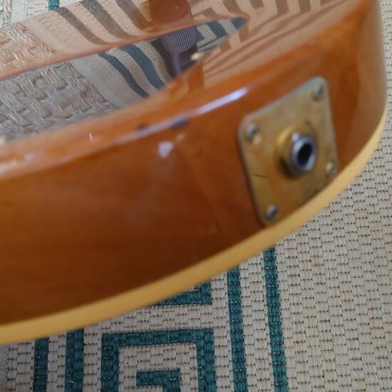 Guitare en bon état général; frettes OK, tête fendue et réparée par mes soins ( 2017 ) Attache courroie d’origine fournie + bannière bleue publicitaire