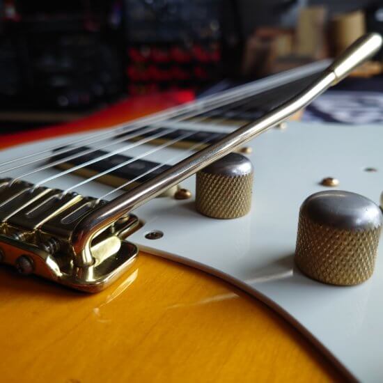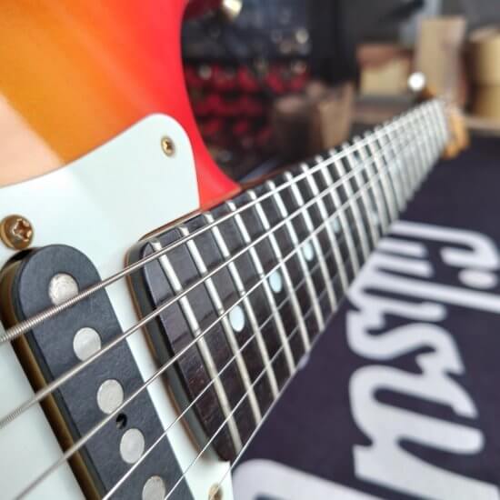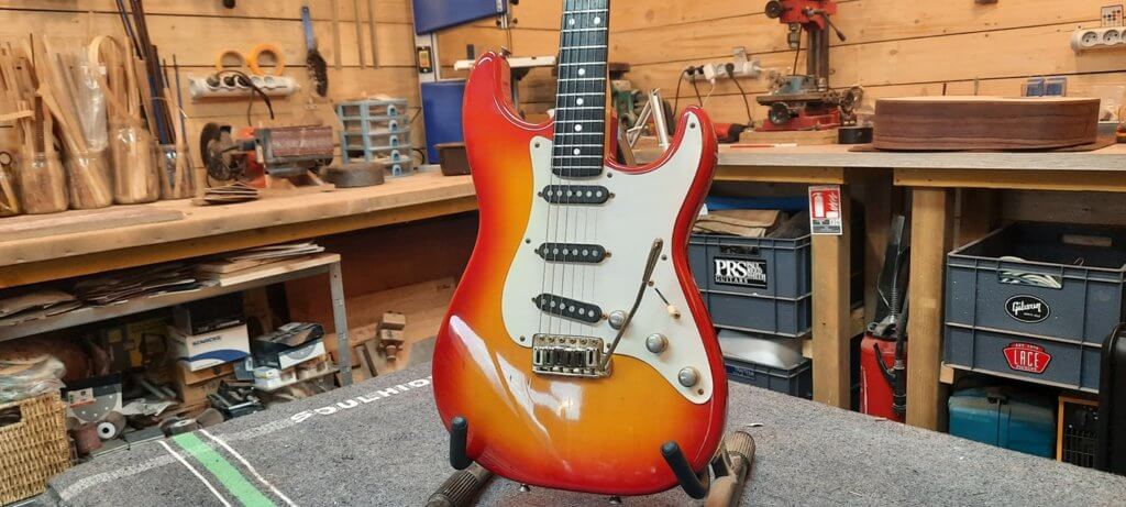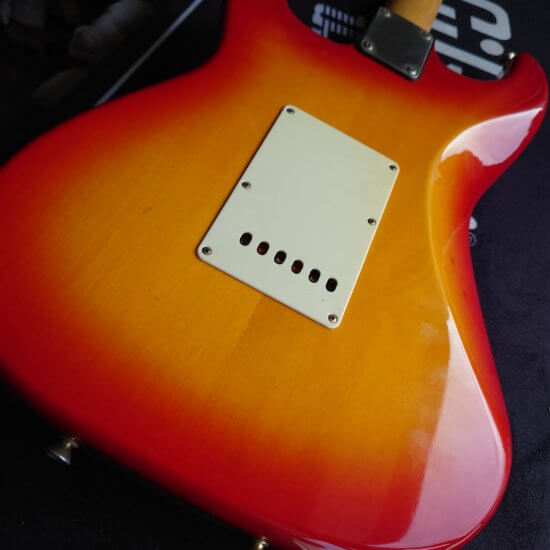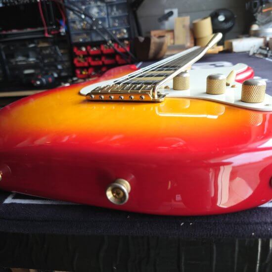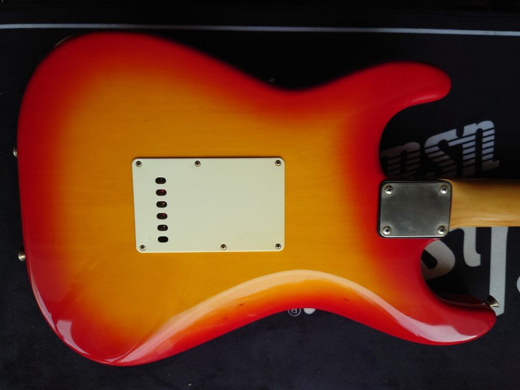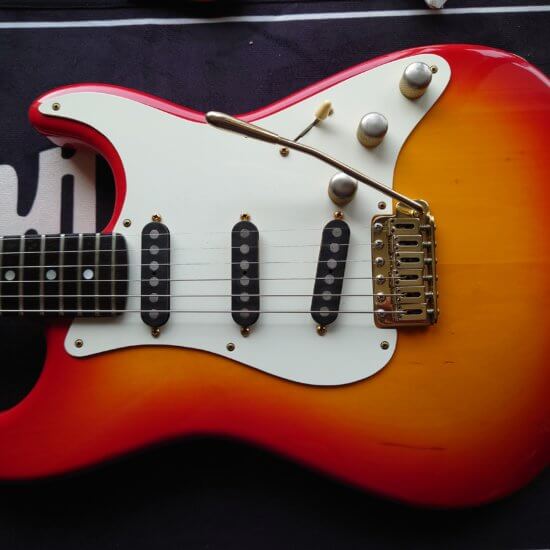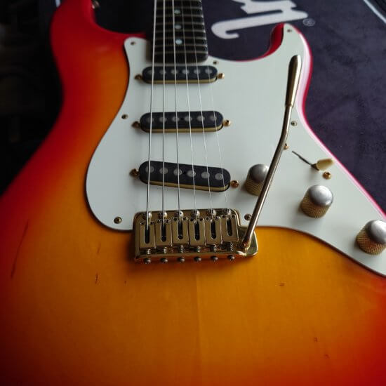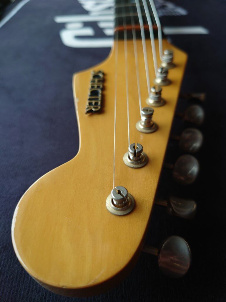 Magnifique et rare Schecter période transition 84/86 en Sienna Sunburst, excelle t état, très peu jouée… accastillage Schecter et bridge en laiton, électronique Schaller, touche ébène sublime. Une des toutes premières de l’époque Dallas Texas qui empruntait donc l’accastillage laiton des Dream Machine des 70’s.